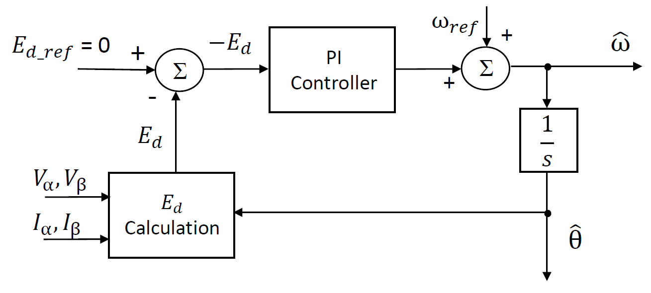 Figure 5.70 shows the basic principle of the ATPLL estimator. Here, The outputs of the estimator are estimated rotor velocity \(\hat\omega\) and estimated rotor angle \(\hat\theta\). The d-axis component \(E_d\) of the back-emf is calculated from the motor stator voltages \(V_{\alpha}, V_{\beta}\) and stator currents \(I_{\alpha}, I_{\beta}\). The reference value of \(E_d\) is zero, therefore the error becomes equal to \(- E_d\). This error is fed to a PI controller. The output of the PI controller is added with a feedforward velocity term \(\omega_{\mathrm{ref}}\), and this addition is the estimated velocity \(\hat\omega\). The estimated velocity is integrated to obtain the estimated rotor angle \(\hat\theta\).