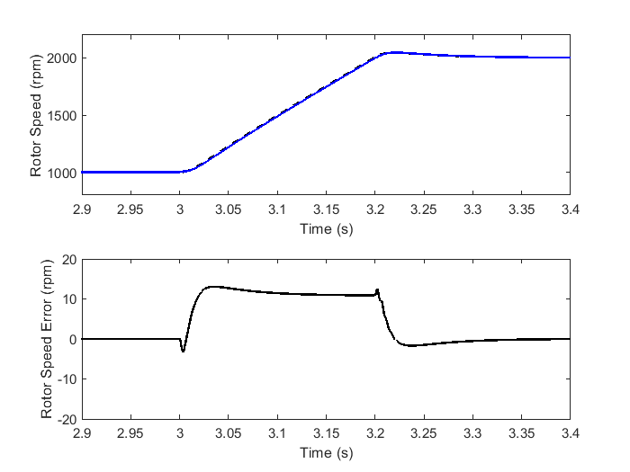 The following results are obtained from numerical simulation for a Leadshine 400 motor. A superimposed plot of actual rotor velocity and the estimated rotor velocity by the ATPLL estimator is shown in Figure 5.72 along with the plot showing the error in estimated velocity. It can be observed that the steady-state velocity error is zero.