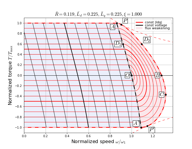The outermost dashed red curve shows the maximum possible torque as a function of velocity. The solid red curves are constant-current plots and the solid black curves are constant-voltage plots. The region shaded light blue is without any FW, while the region shaded pink is the FW region. The dashed curve \(A-D_1-O-A'\) shows the transition between FW and no-FW regions, while the dashed curve \(P-D_2-B-C-P'\) shows the limiting boundary of the FW region. It can be seen that the maximum torque value in the FW region is lower than that in the no-FW region, and it reduces as the velocity increases.