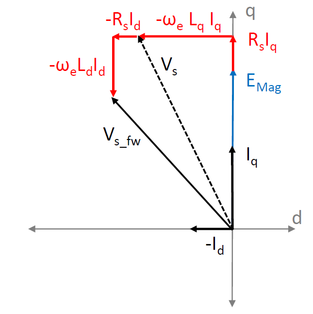 In order to allow a further increase in motor velocity, it is necessary to restrict the increase in \(V_{qs}\) while allowing \(E_{\mathrm{mag}}\) to increase. For a positive velocity, this is achieved by making the \(\omega_e L_{d} I_{d}\) term negative, which in turn is done by making \(I_{d}\) negative. Figure 5.80 shows the vector diagram with a negative \(I_{d}\) injected in the motor. Here, \(V_{s}\) (dashed black arrow) shows the stator voltage vector with \(I_{d} = 0\), whereas \(V_{s\_fw}\) (solid black arrow) shows the stator voltage vector with \(I_{d} < 0\). Due to the opposing effect of the negative \(\omega_e L_{d} I_{d}\) term, the magnitude of \(V_{s\_fw}\) is lower than the magnitude of \(V_{s}\), for the same values of \(E_{\mathrm{mag}}\) and \(I_{q}\).